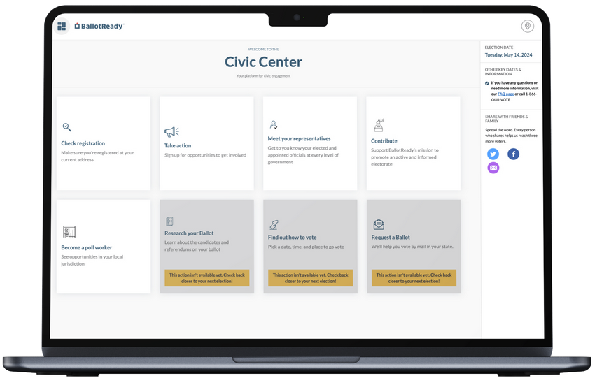 Everything a constituent needs to be civically engaged, all in one place. At any time, constituents can register to vote, request & return a mail-in ballot, contact their representatives, research their ballot, make a plan to vote and explore opportunities to run for office.