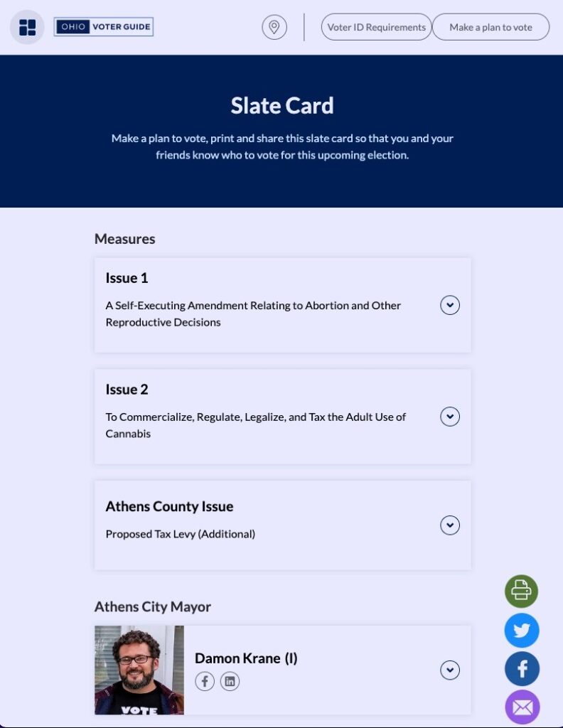 One of Innovation Ohio’s top priorities was picking a voter information tool that most closely matched the experience at the ballot box. Working with the BallotReady tool, Innovation Ohio created a nonpartisan slate card. This unique strategy offered a few key advantages: